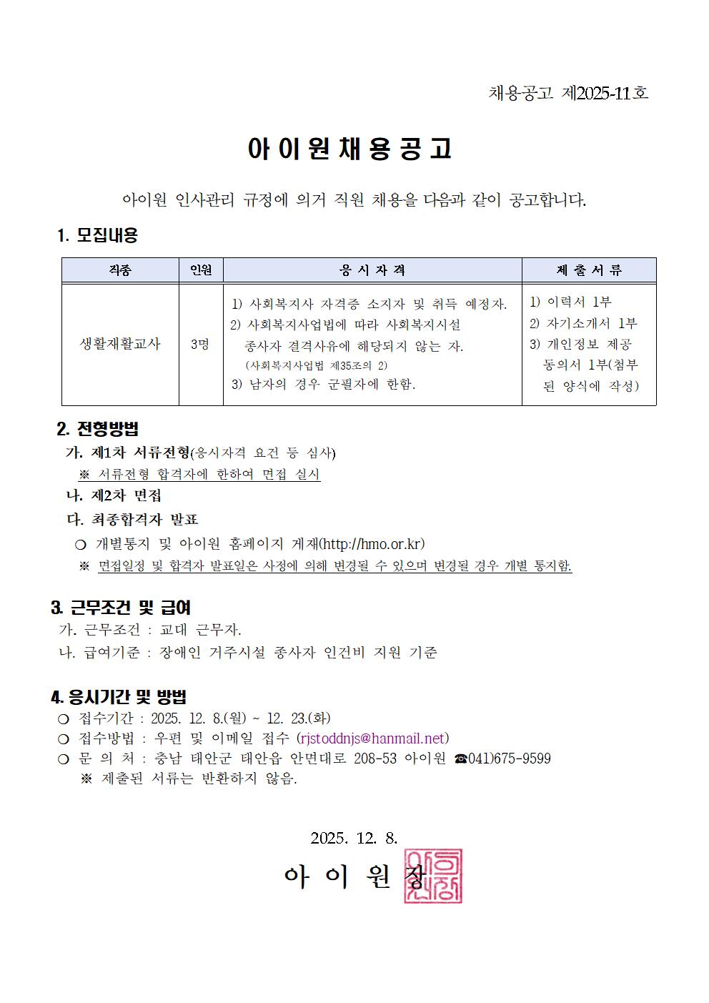 아이원 생활재활교사 채용 공고